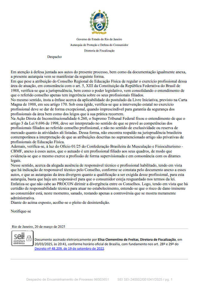 Contexto: Academia e Treinador Esportivos formado pela CBMF e sem nenhum vínculo com o CREF foram fiscalizadas conjuntamente pelo CREF e PROCON. O entendimento inicial do PROCON foi pela interdição do estabelecimento. A academia foi reaberta poucas horas após a apresentação da defesa e da documentação que comprovam a legalidade da CBMF.