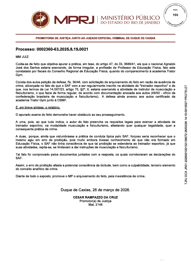 Contexto: O Treinador Esportivo foi denunciado por exercício ilegal da profissão, prestou esclarecimento, apresentou defesa e o prórpio Ministério Público requereu o arquivamento do feito. O Juiz seguiu o MP e o processo foi arquivado.